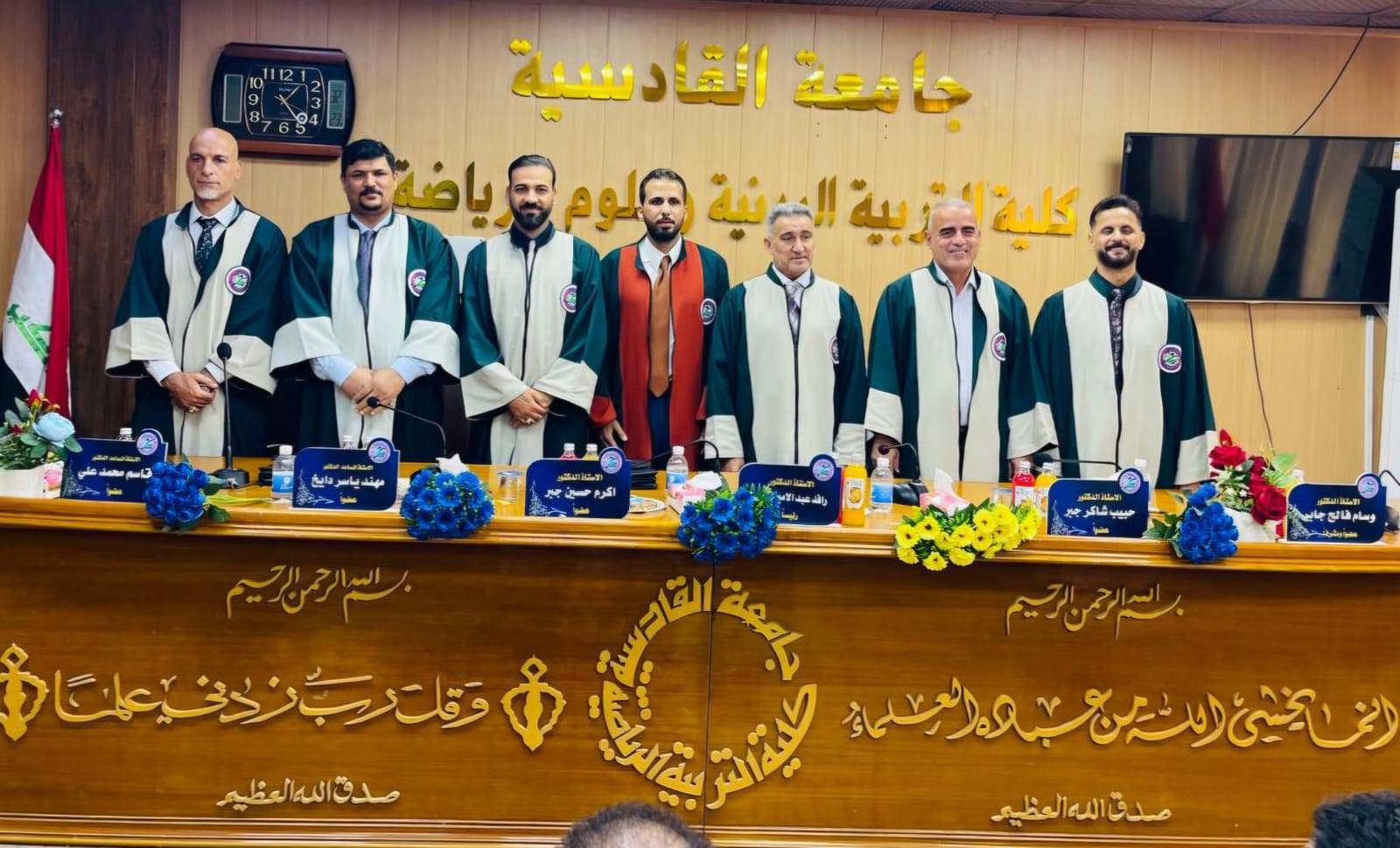 A doctoral thesis was discussed at the College of Physical Education and Sports Sciences at Al-Qadisiyah University, titled “The Effect of High-Intensity Intermittent Training and Playing with Different Surfaces on Some Biomotor Abilities, Skills, and Tactical Performance of Young Soccer Players.” The thesis was presented by student Mohammed Jadou’ Hani, under the supervision of Prof. Wissam Faleh Jaber.