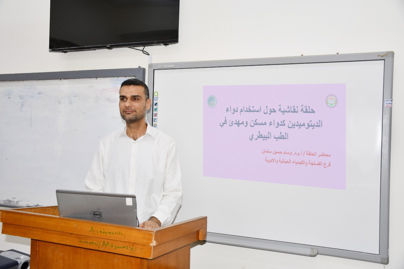 The College of Veterinary Medicine at Al-Qadisiyah University held a discussion session on the use of detomidine as an analgesic and sedative in veterinary medicine. Assistant Professor Wissam Hussein Salman presented the session. The aim was to identify the most important uses of detomidine in veterinary medicine and to emphasize the importance of this drug as a pain reliever and sedative for animals. The most important recommendations include the need to correctly determine the appropriate dosage for each animal to ensure the desired therapeutic effect and avoid side effects.