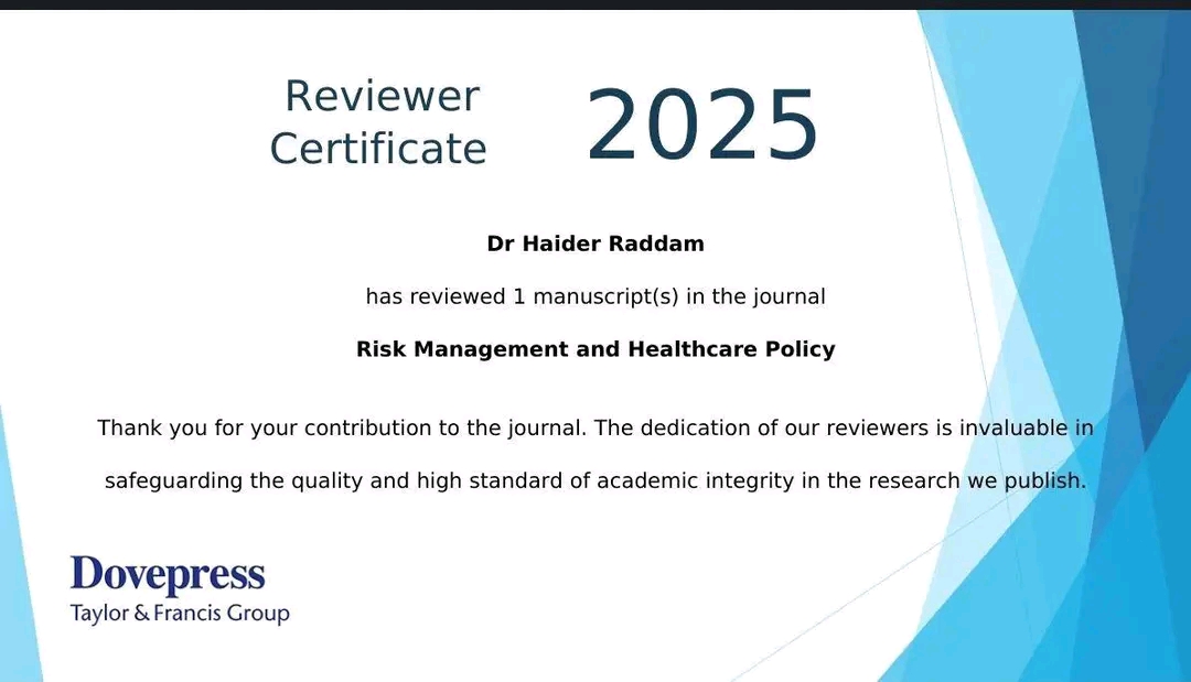 Dr. Haider Kazim Radam, a lecturer at the College of Nursing at Al-Qadisiyah University, was selected as a member of the peer review panel to evaluate a scientific paper in the prestigious international journal “Risk Management and Healthcare Policy.” This journal, published by the international publishing house Dove Medical Press Taylor & Francis Group, is a Scopus Q1 indexed journal, placing it at the top of the list of scientific journals in terms of impact and quality.