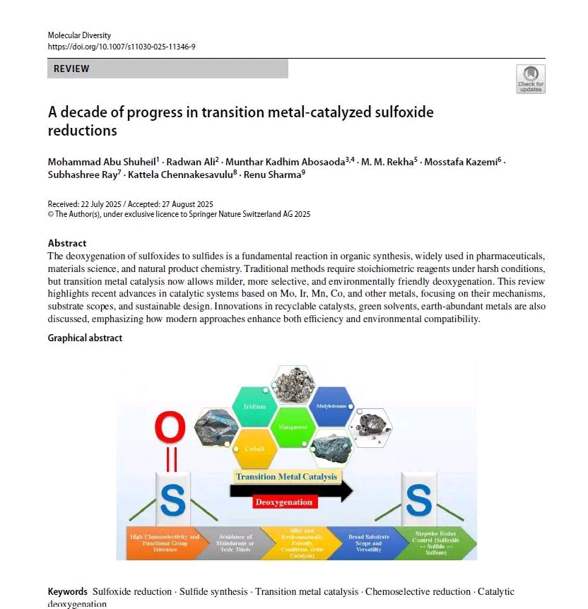 Assistant lecturer Radwan Ali Katea, a lecturer at the College of Dentistry at Al-Qadisiyah University, published a scientific paper in the journal Molecular Diversity, published by Springer Nature. The journal is indexed in Scopus and Clarivate, and has an impact factor of 3.8. It is also ranked in the first quartile (Q1) of Scopus. The paper is titled “A Decade of Progress in Transition Metal-Catalyzed Sulfide Reductions.”