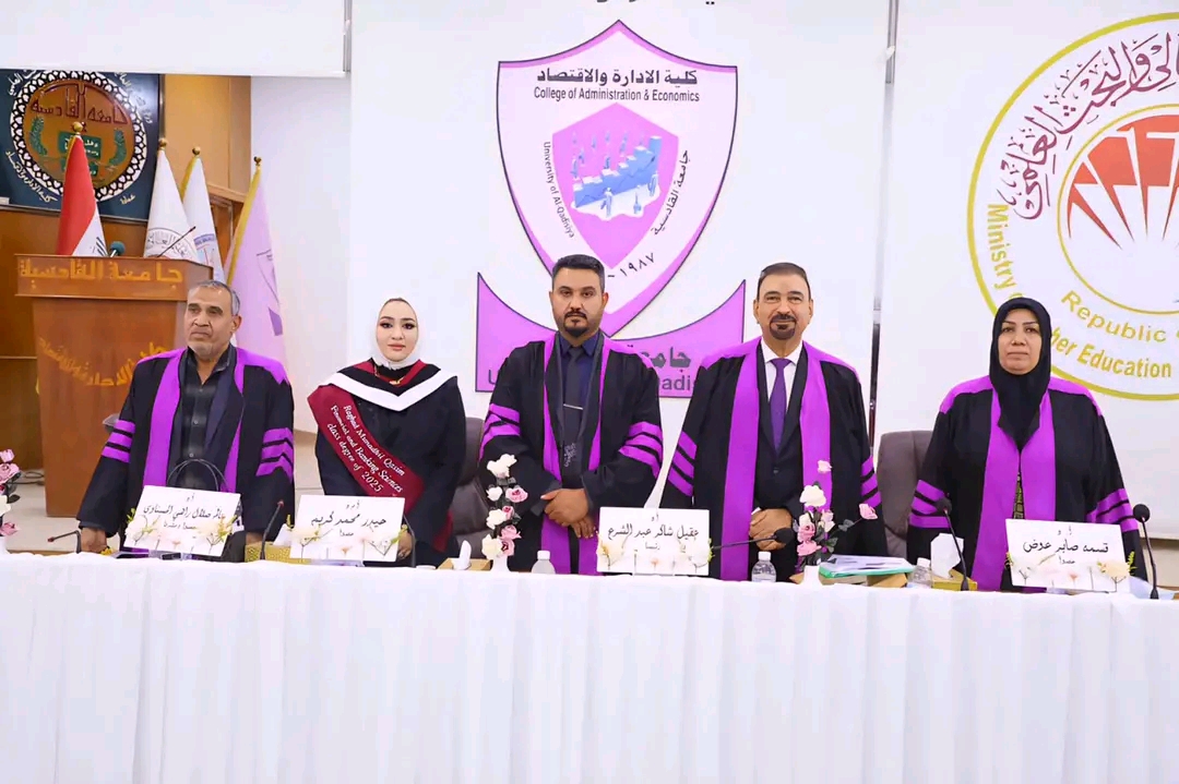A master’s thesis titled “The Role of Stock Performance Evaluation Models in Building an Investment Portfolio: An Applied Study in the Iraq Stock Exchange for the Period (2018-2023)” was discussed in the Department of Financial and Banking Sciences at the College of Administration and Economics at Al-Qadisiyah University. The thesis was presented by student Raghad Munadhil Qasim and supervised by Professor Dr. Salem Salal Al-Hasnawi.