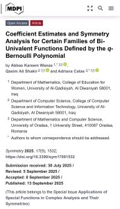 Assistant Professor Dr. Abbas Karim and Nas Al-Sharifi published a scientific research paper entitled “Coefficient Estimates and Symmetry Analysis for Certain Families of Biaval Functions Defined by the q-Bernoulli Polynomial” in the international journal Symmetry, Volume 17, Issue 9, 2025. The journal is listed in the Scopus database in the first quartile (Q1) with a CiteScore of 5.3 and in Clarivate databases with an Impact Factor of 2.2. The journal is published by the Multidisciplinary Digital Publishing Institute (MDPI).