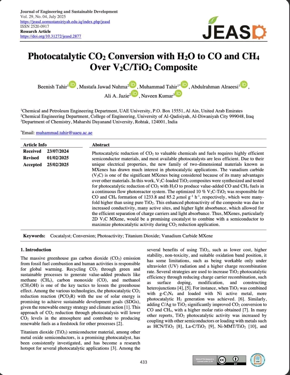 Prof. Dr. Ali Abdul Hussein Jaza’a, Dean of the College of Engineering, and Lec. Dr. Mustafa Jawad Na’ma have contributed to the development of a new engineering material capable of converting carbon dioxide (CO2), the primary cause of global warming, into two valuable fuels: carbon monoxide (CO) and methane (CH4), using only light and water energy! In a remarkable international scientific achievement,