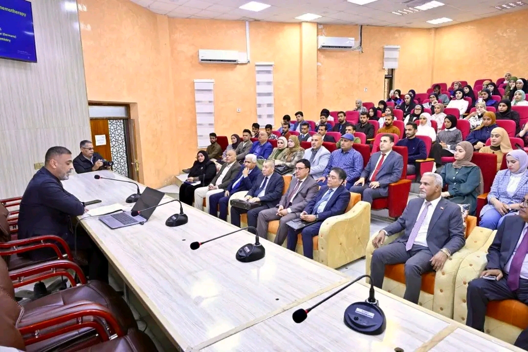 The workshop was presented by Dr. Najm Aboud Al-Masoudi, Scientific Advisor at the University of Konstanz, Germany, and Professor of Organic and Pharmaceutical Chemistry, was attended by the Vice President of the University for Scientific Affairs, Professor Dr. Sattar Abdul-Hassan Al-Fatlawi, a number of professors from Iraqi universities, as well as faculty members and students from the College of Science. The workshop covered the latest research findings in pharmaceutical chemistry for cancer treatment, with a focus on designing new molecules that target biological pathways associated with the most dangerous types of cancer, particularly pancreatic, colon, breast, and prostate cancer. The workshop also covered the causes and types of cancer, explained the genes responsible for these diseases, and outlined modern methods for diagnosing certain types of cancer.