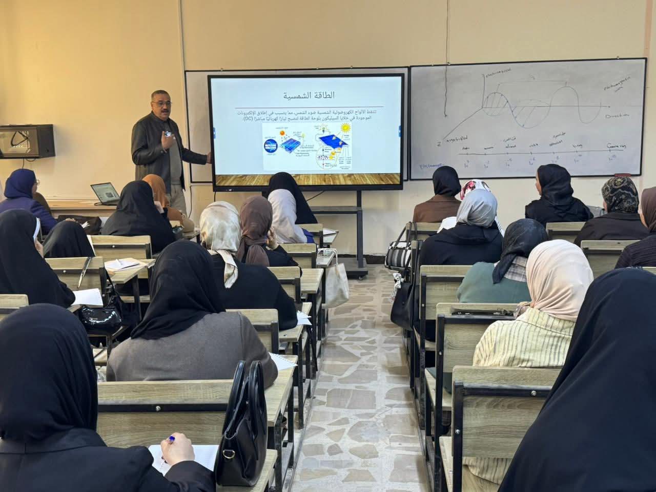 Under the patronage of the President of Al-Qadisiyah University, Professor Dr. Rahi Kalaf Mahdi Al-Yasiri, and the supervision of the Dean of the College of Science, Professor Dr. Salwan Ali Obaid Al-Hamzawi, the College of Science organized a scientific workshop as part of the Global Entrepreneurship Week activities, under the slogan “From Mesopotamia… Ideas Take Off,” entitled “The Strategic Importance of Using Solar Energy in Generating Electricity and Its Economic Feasibility.” The workshop was presented by Assistant Professor Dr. Haider Saad Abdulbaqi