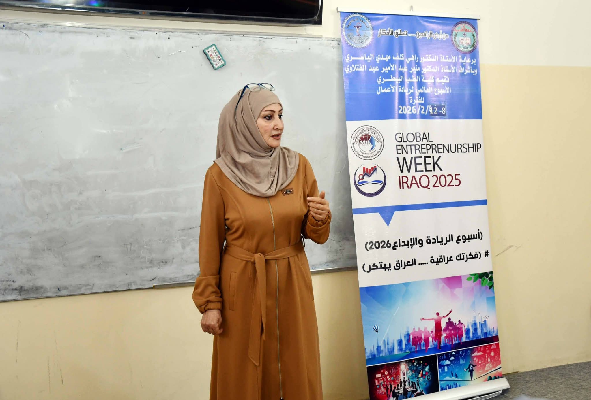 the College of Veterinary Medicine at Al-Qadisiyah University conducted a workshop as part of Entrepreneurship Week, entitled “Transforming Passion into Entrepreneurship.” The workshop was presented by Ms. Miad Qadir Al-Jashami.