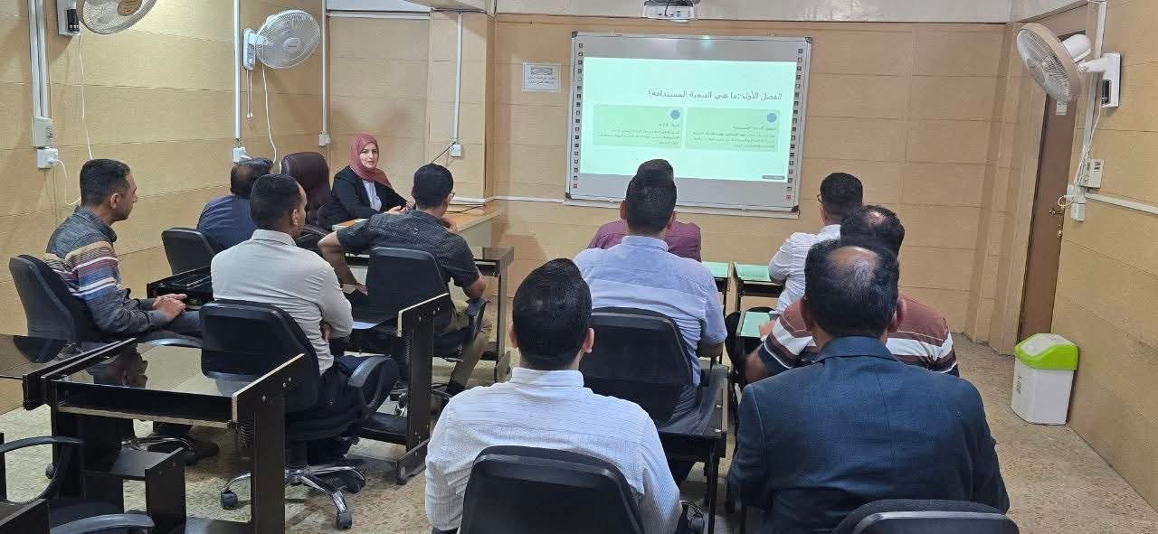 As part of the University’s Sustainable Week activities and in line with the University’s vision of integrating innovative solutions with environmental responsibility, the College of Engineering at Al-Qadisiyah University organized a specialized training course entitled “Engineering Innovation in Achieving Sustainable Development.” The course was held in the Continuing Education Hall and was presented by Assistant Professor Dr. Masi Faisal, Dr. Aqeel Latif, and Assistant Lecturer Shamam Kadhim.