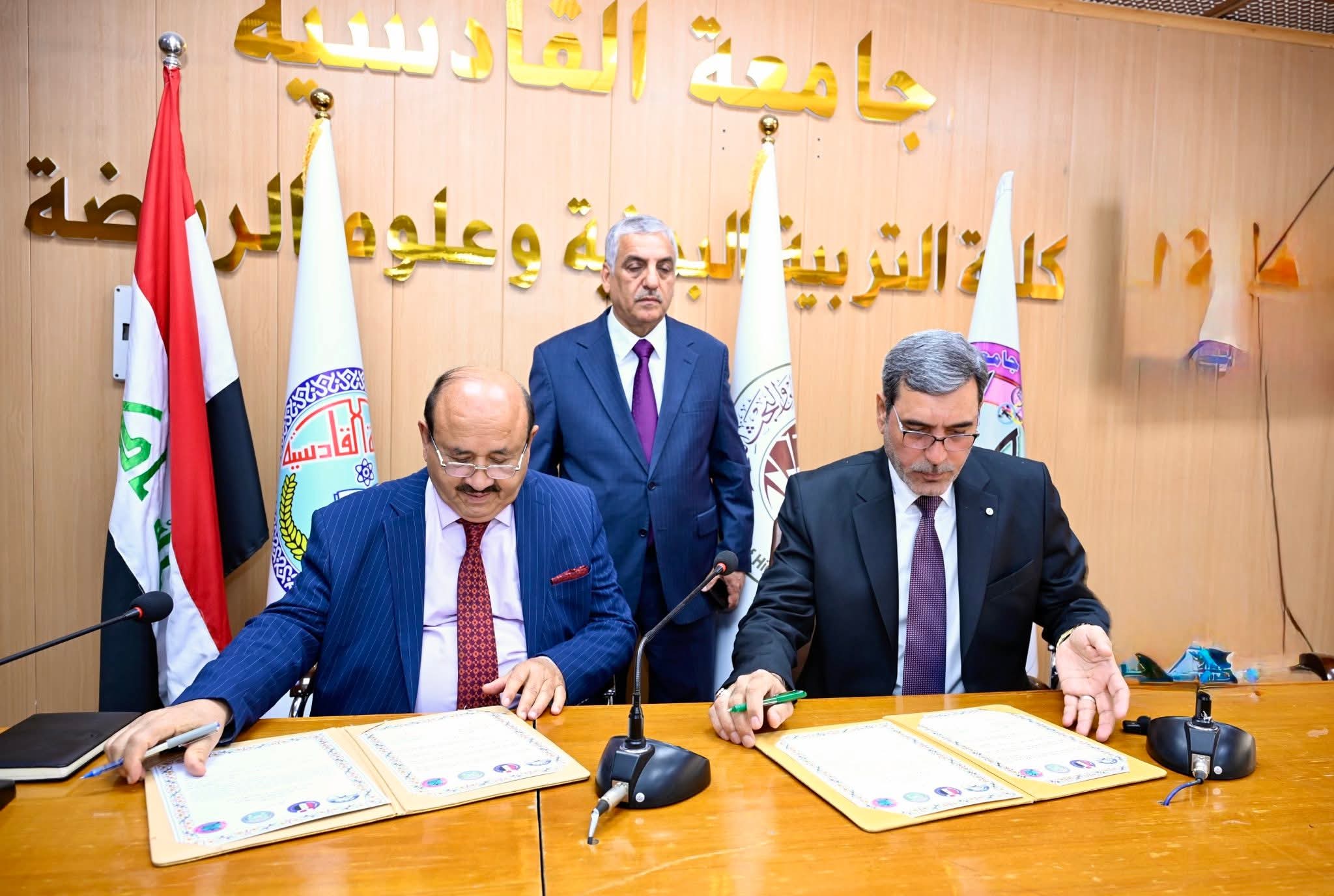 The College of Physical Education and Sports Sciences at Al-Qadisiyah University, represented by its Dean, Professor Dr. Bashir Shaker Al-Awadi, signed a preliminary joint scientific cooperation agreement with the College of Physical Education and Sports Sciences at Al-Mustafa Private University, represented by its Dean, Professor Dr. Mahjoub Ibrahim Yassin Al-Mashhadani. The signing ceremony was attended by the Assistant President of the University for Administrative Affairs, Professor Dr. Muhammad Hamza Al-Hashemi, members of the college council, and a number of faculty members.